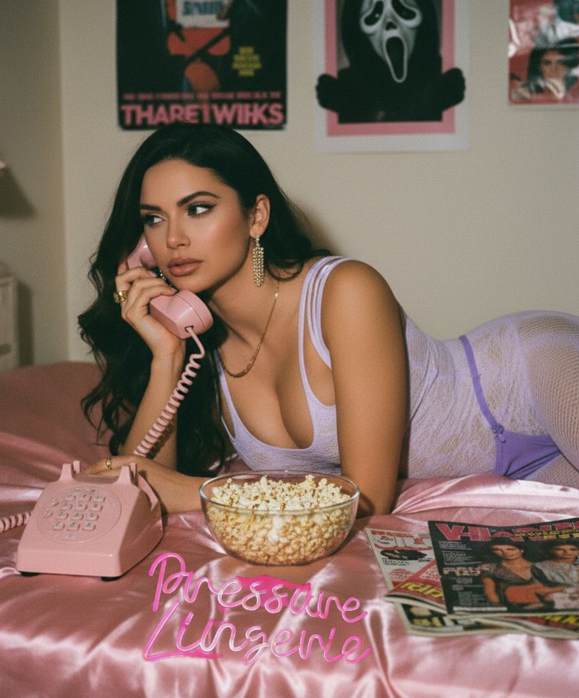 Designed for bold confidence, this crotchless jumpsuit is perfect for layering under lingerie or wearing solo for an unforgettable night in. Its color appears as a soft lilac tone under certain lighting — giving it a romantic glow that shifts between pink and purple hues.