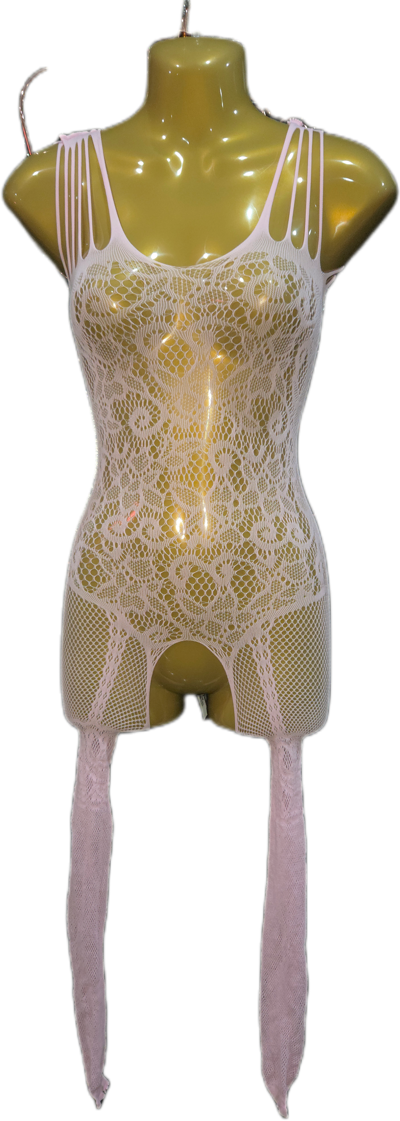 irresistibly soft and stretchy with the Pink Lace Fishnet Jumpsuit from Pressure Lingerie. This daring one-piece hugs every curve with its delicate lace pattern and open fishnet design, offering a flattering stretch that comfortably fits most plus sizes.