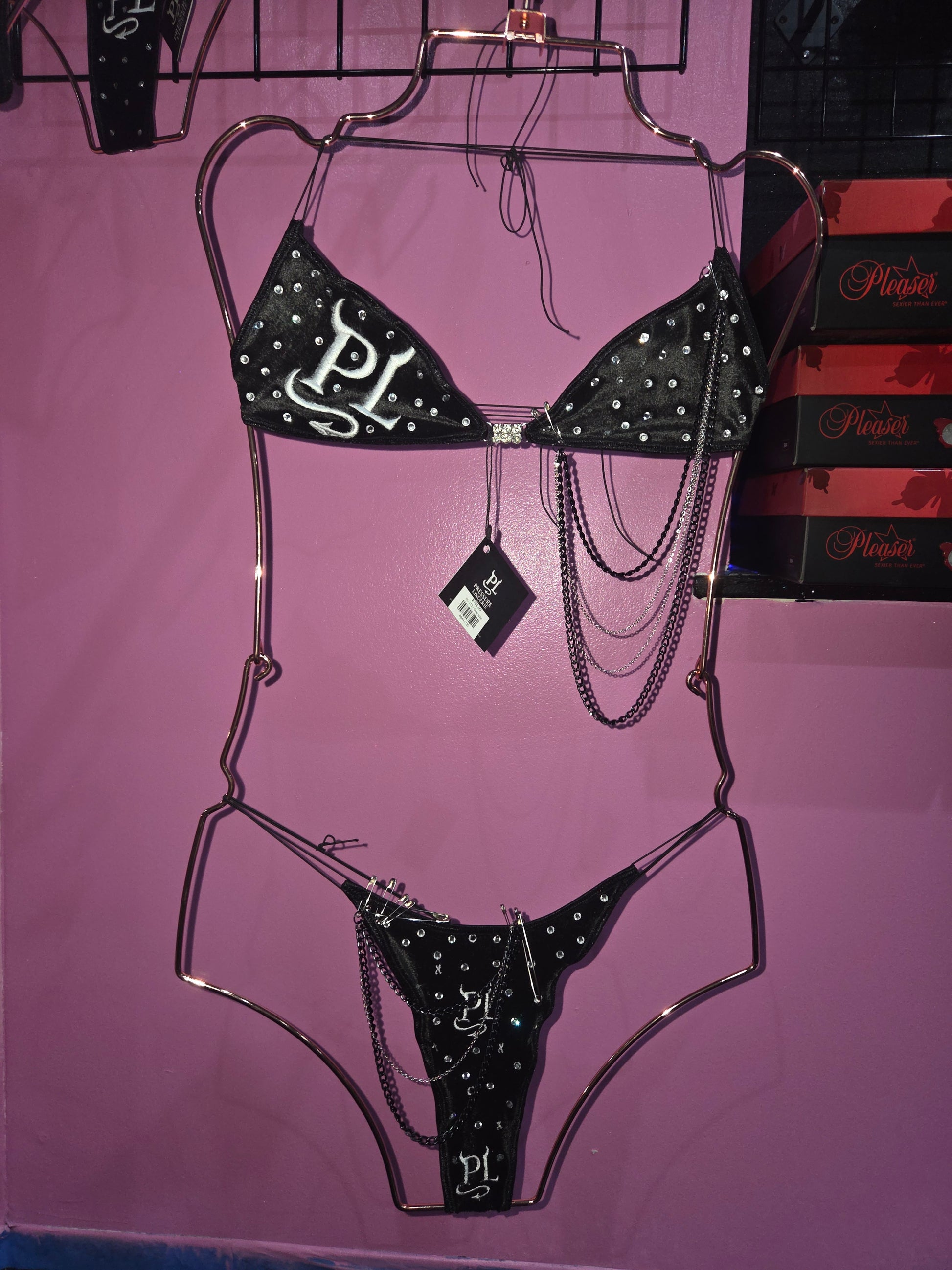 Suede 2piece bikini PL patch rhinestones chains and clothespins