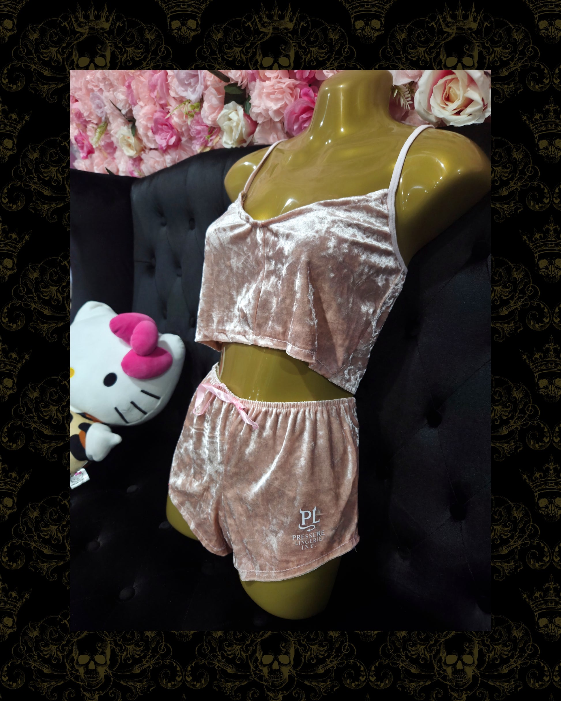 Velvet Two-Piece Pajama Set from Pressure Lingerie Inc. Designed for comfort and style, this dreamy set includes a soft velvet crop cami top and matching elastic-waist shorts — perfect for lounging, bedtime, or turning heads at a girls’ night in.